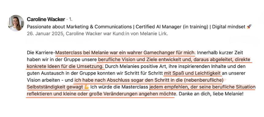“Was mich im Privaten wie im Beruflichen wirklich überrascht ist, dass ich Dinge jetzt nach dem Coaching schneller angehe. Vorher habe ich Dinge aufgeschoben. Ich ertappe mich dabei, dass ich es nicht mehr oder nur noch deutlich weniger mache.”